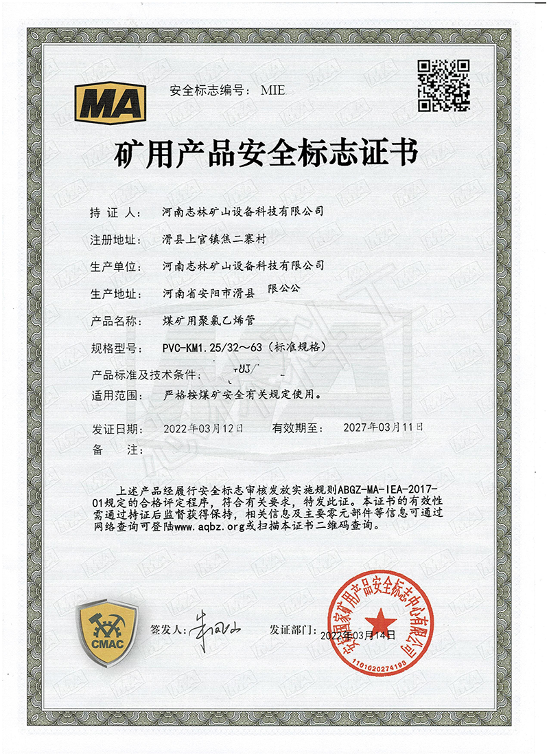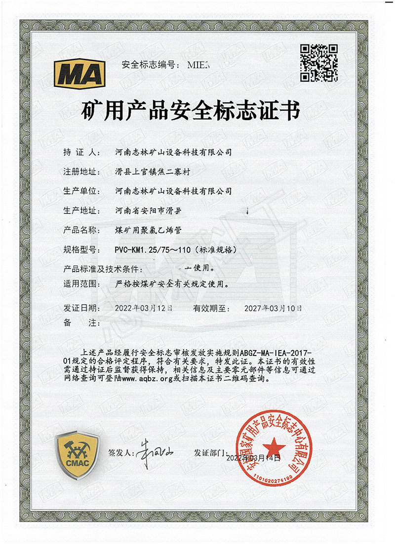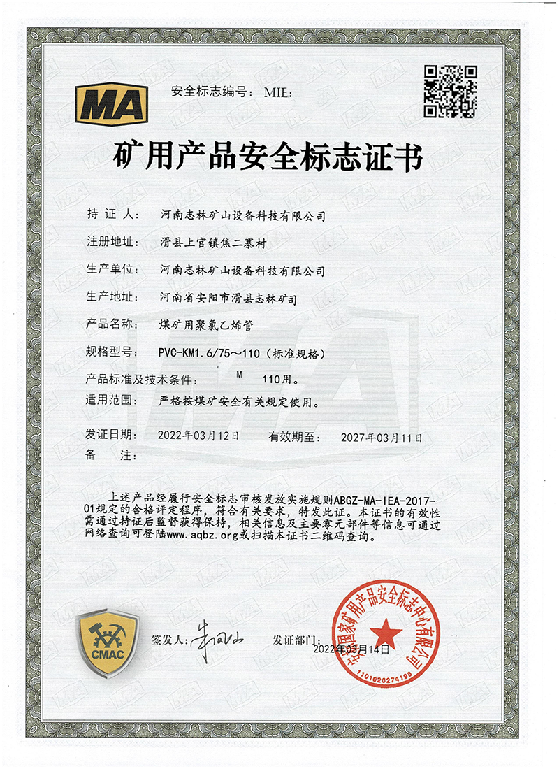志林科工煤安證產(chǎn)品再添4個(gè),這也給煤礦企業(yè)安全達(dá)標(biāo)生產(chǎn)提供了*多的選擇。這次志林科工獲得**礦用產(chǎn)品安全標(biāo)志是4個(gè)型號(hào)的煤礦用聚氯乙烯管:km1.0/75-110、km1.25/32-63、km1.25/75-110、km1.6/75-110,主要用于煤礦井下抽放瓦斯、 正壓通風(fēng)、負(fù)壓通風(fēng)、供水排水、噴漿等作業(yè)。
